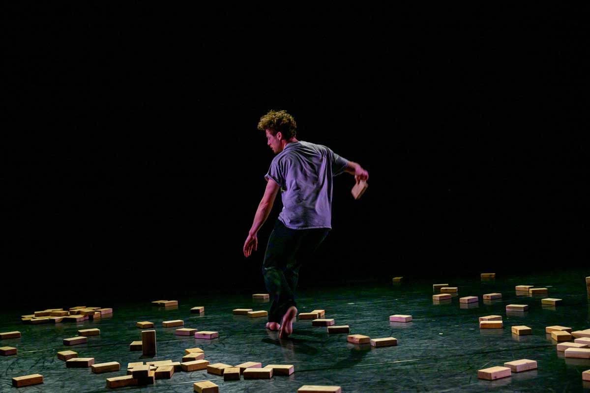 With serendipity, rigour and ingenuity, dance artist Josh Martin performs a solo together with 250 small cedar blocks. Moments emerge and transform: whimsical, primal, risky, futile and tender. Balance is fragile, tested, and there are no mistakes. Composer James B. Maxwell and lighting designer James Proudfoot frame and hold Josh with their sound and light, expanding and condensing his world. Developed through a collaboration with Josh that has spanned four years, blocking reveals the body, breath and stillness.